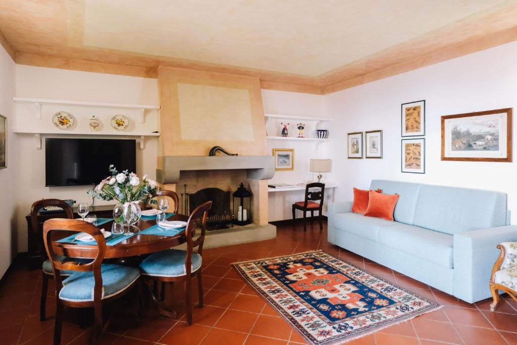 Die Wohnung besteht aus einem Schlafzimmer und einem separaten Wohnzimmer mit zwei Betten. Den Gästen steht eine voll ausgestattete Küche zur Verfügung, die über Kochfeld, Kühlschrank, Geschirrspüler, Mikrowelle sowie Kaffee- und Teezubereitungsmöglichkeiten verfügt. Das Badezimmer ist mit einer bodengleichen Dusche ohne Einstieg sowie einem Bidet ausgestattet. Weitere Ausstattungsmerkmale im Zimmer umfassen Bettwäsche, Handtücher, allergikerfreundliche Kissen (ohne Federn), Bügeleisen mit Bügelbrett, Heizungssystem sowie einen Sitzbereich mit Sofa am Kamin, außerdem gibt es Stauraum im Kleiderschrank und einen Wäscheständer.
